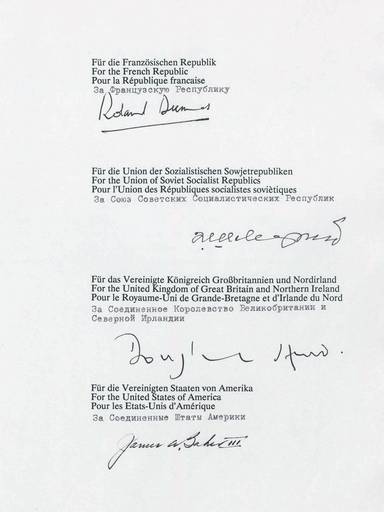 Unterschriften der Vertreter der vier Siegermächte des Zweiten Weltkriegs (Frankreich, UdSSR, Großbritannien, USA) über den Vertrag zur Zukunft Deutschlands im Jahr 1990