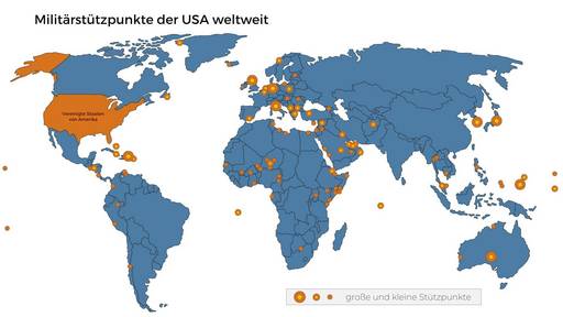 MilitĂ€rstĂŒtzpunkte der USA in der Welt. Bei genauem Hinschauen ergibt sich ein Ring rund um Russland. Die USA unterhalten rund 750â800 MilitĂ€rstĂŒtzpunkte in etwa 80 LĂ€ndern und Territorien. Darunter befinden sich groĂe und sehr leistungsfĂ€hige MilitĂ€rbasen. Russland unterhĂ€lt hingegen viel weniger StĂŒtzpunkte im Ausland. Es sind etwa 20. Viele davon sind deutlich kleiner und weniger leistungsfĂ€hig als groĂe US-Basen.