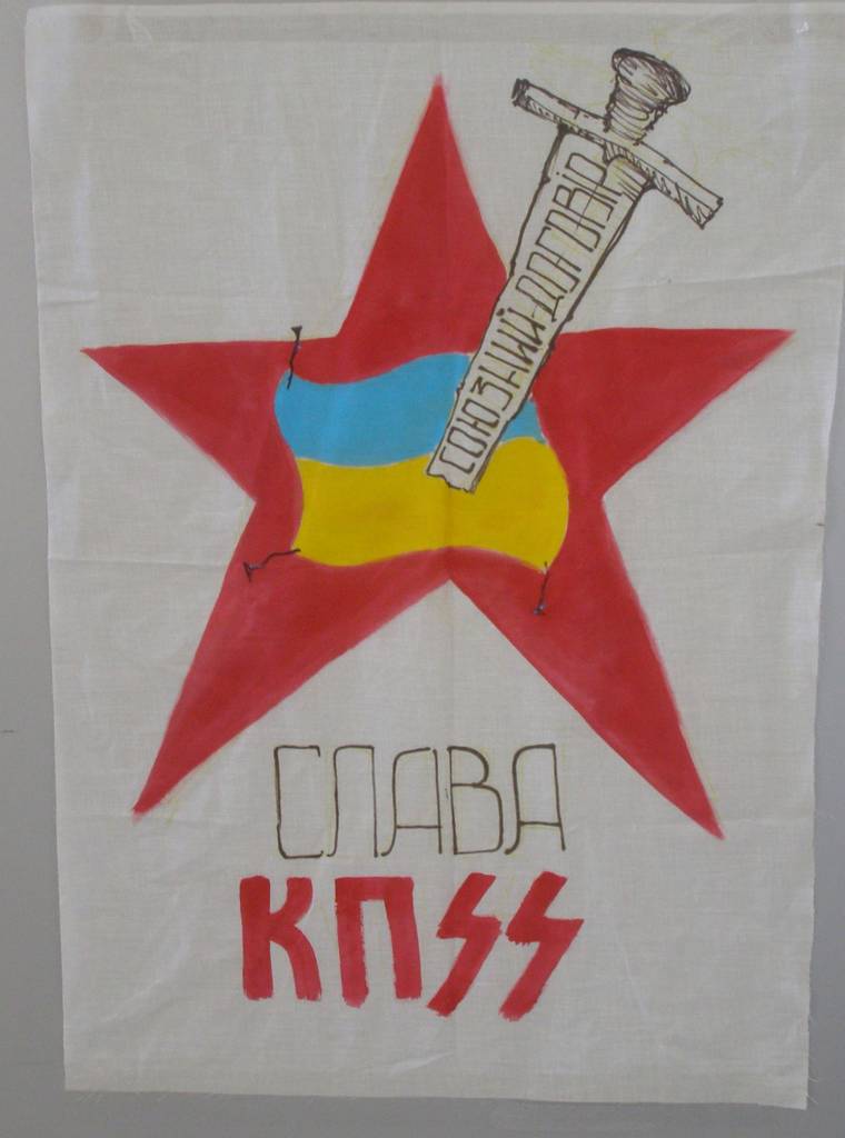 Sarkastisches Plakat protestierender Studierender gegen die Kommunistische Partei der Sowjetunion: „Слава КПSS" („Ruhm der KPdSU"), „SS" in der Form nationalsozialistischer Runen bewertet die Diktatur der Sowjetunion wie das NS-Regime in Deutschland